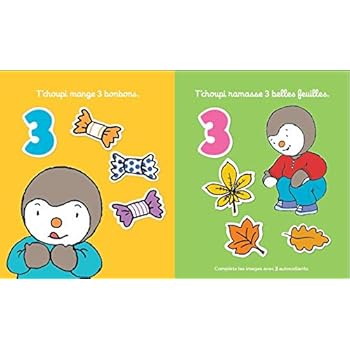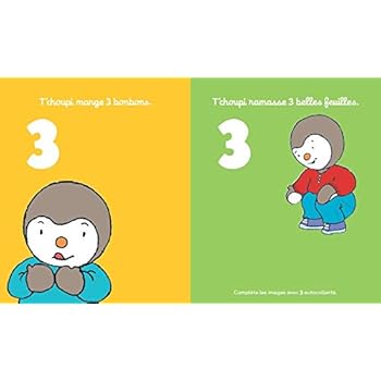 1, 2, 3 ... apprend à compter avec T'choupi !De grosses gommettes, faciles à coller et à décoller, pour apprendre à compter ! T'choupi a 1 gros ballon rouge 2 patins à roulettes 3 bonbons... Sur chaque page, l'enfant colle un gros chiffre, de 1 à 9, et la quantité d'objets qui correspond.