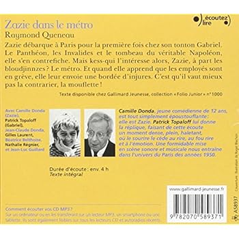 Zazie débarque à Paris pour la première fois chez son tonton Gabriel. Le Panthéon, les Invalides et le tombeau du véritable Napoléon, elle s'en contrefiche. Mais kess-qui l'intéresse alors, Zazie, à part les bloudjinnzes ? Le métro. Et quand elle apprend que les employés sont en grève, elle leur envoie une bordée d'injures. C'est qu'il vaut mieux pas la contrarier, la mouflette !Camille Donda, jeune comédienne de 12 ans, est tout simplement époustouflante : elle est Zazie. Patrick Topaloff lui donne la réplique, faisant de cette écoute un moment dense, plein, haletant, où le sourire le cède au rire, au fou rire et à l'émotion. Une formidable mise en scène sonore et musicale nous entraîne dans l'univers du Paris des années 1950.